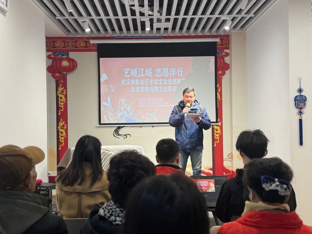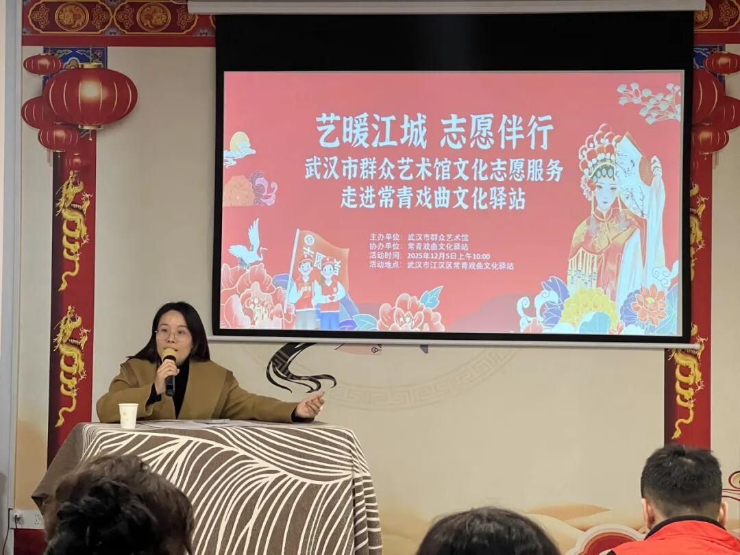 以志愿星光点亮传承薪火,用非遗声腔唱响冬日温情。在第40个国际志愿者日,12月5日上午,“艺暖江城 志愿伴行”武汉市群众艺术馆文化志愿服务活动走进江汉区常青戏曲文化驿站,为市民朋友们带来了一场别开生面的湖北小曲艺术讲座。本次活动由武汉市群众艺术馆主办,江汉区文化馆、常青戏曲文化驿站协办。